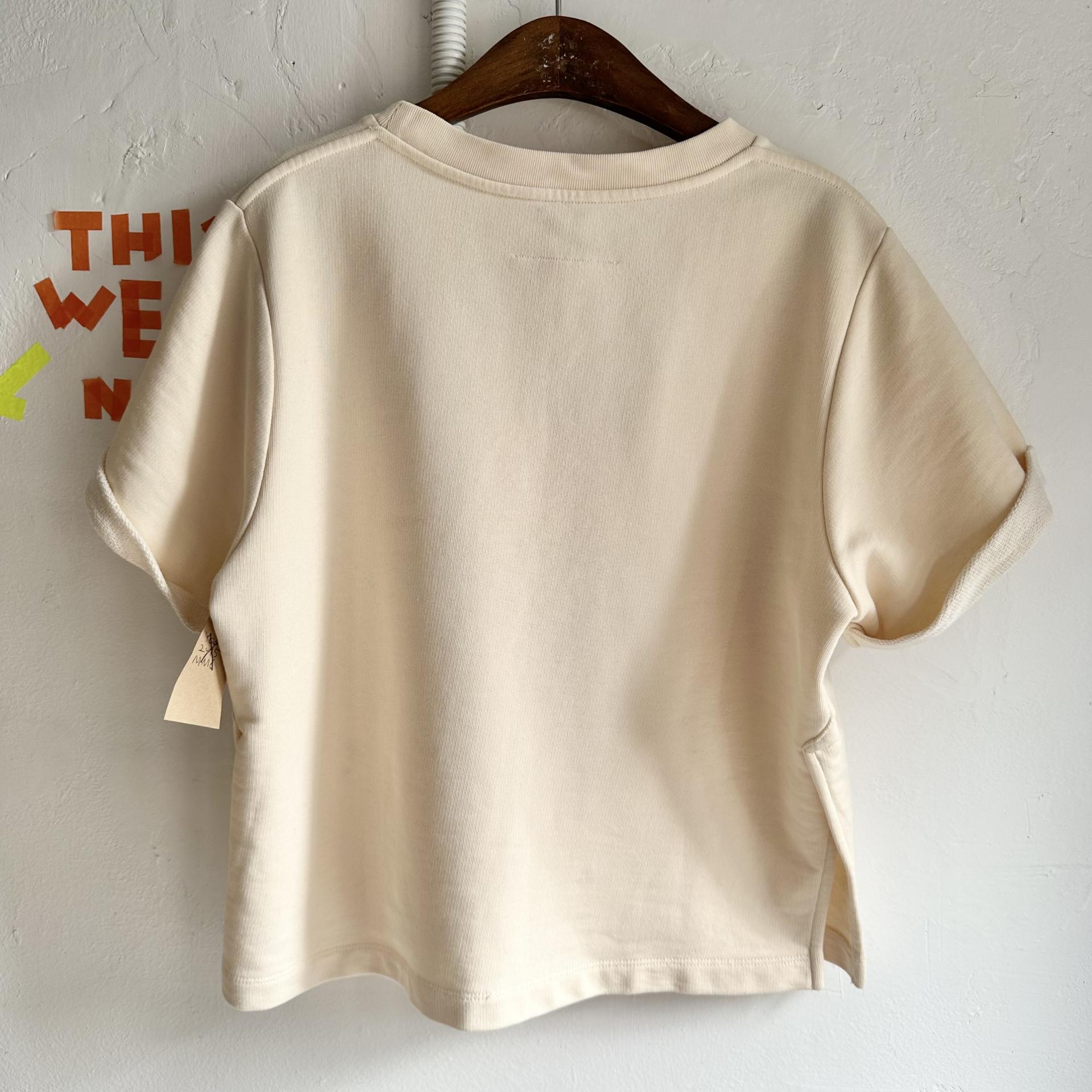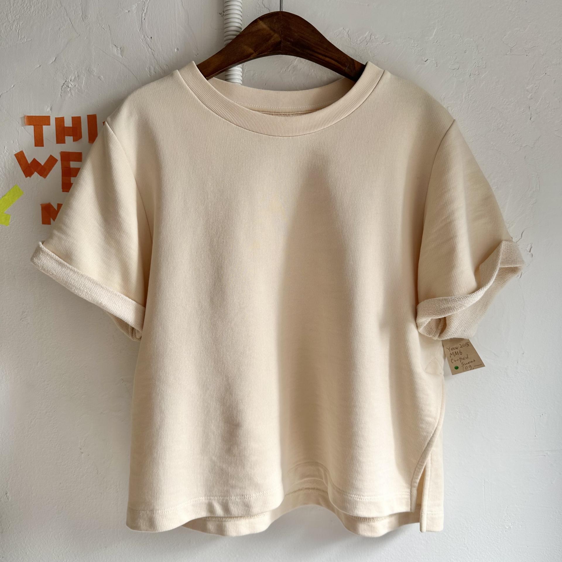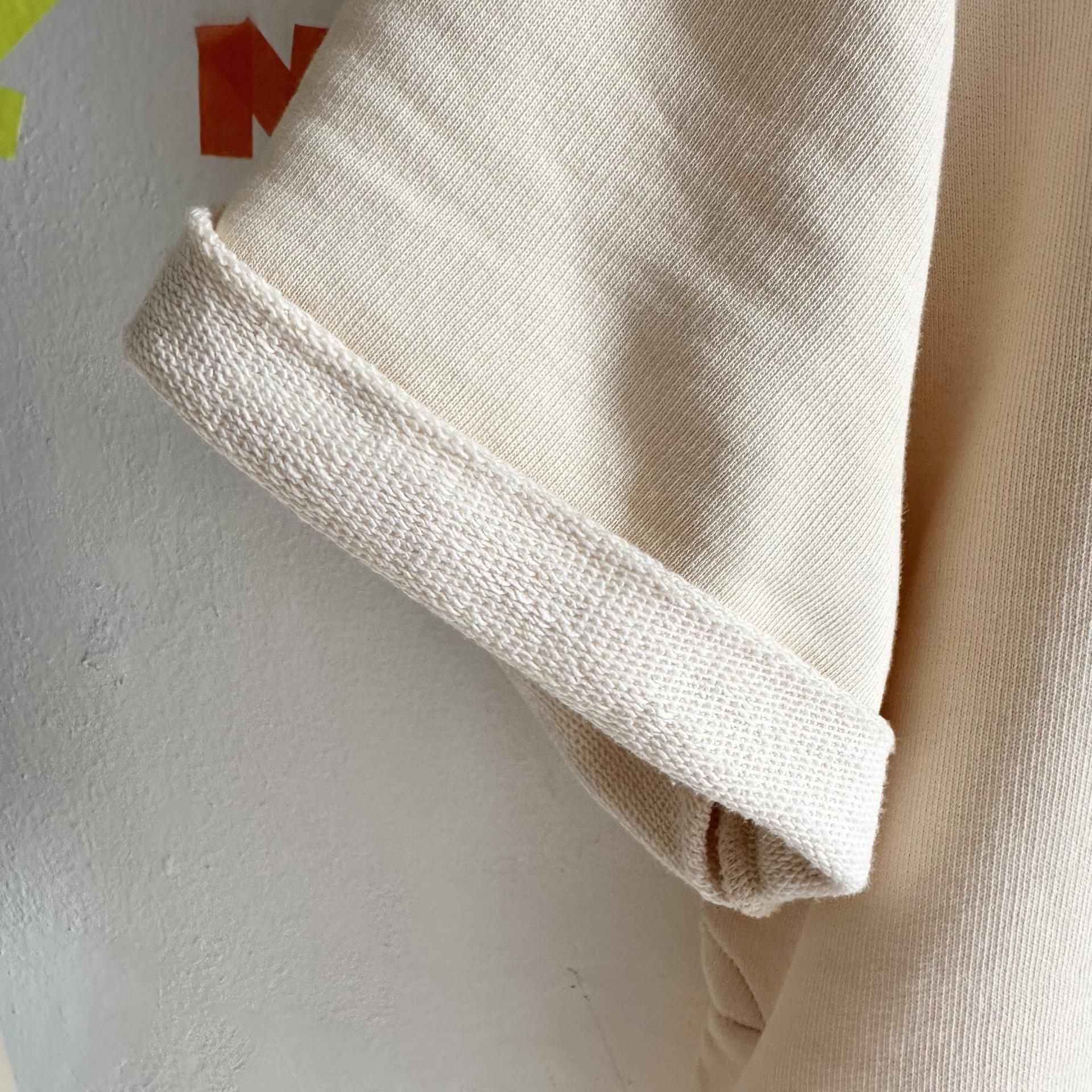 MM6의 오프화이트 컬러 스웻셔츠입니다. 오버핏의 크롭한 기장 롤업된 소매가 귀여워요. 적당히 도톰한 테리 소재로 봄가을 유용하게 활용 가능합니다.