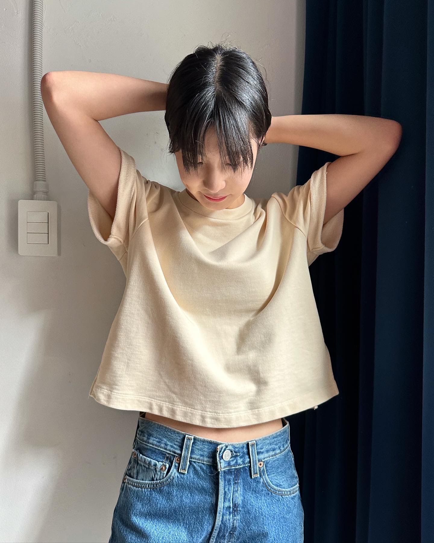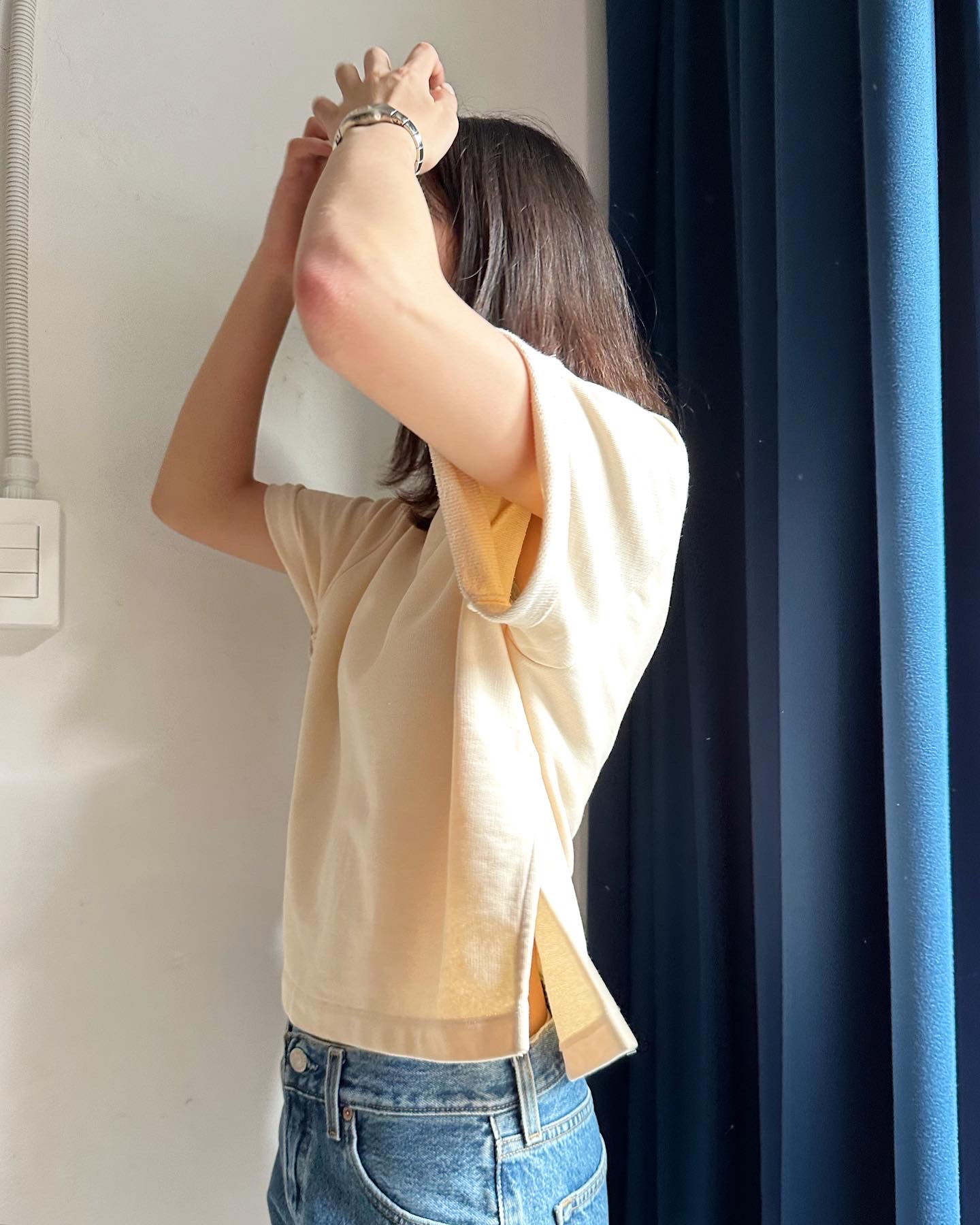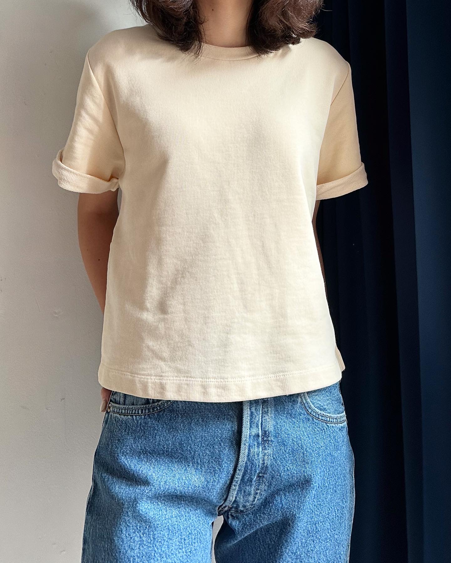 MM6의 오프화이트 컬러 스웻셔츠입니다. 오버핏의 크롭한 기장 롤업된 소매가 귀여워요. 적당히 도톰한 테리 소재로 봄가을 유용하게 활용 가능합니다.