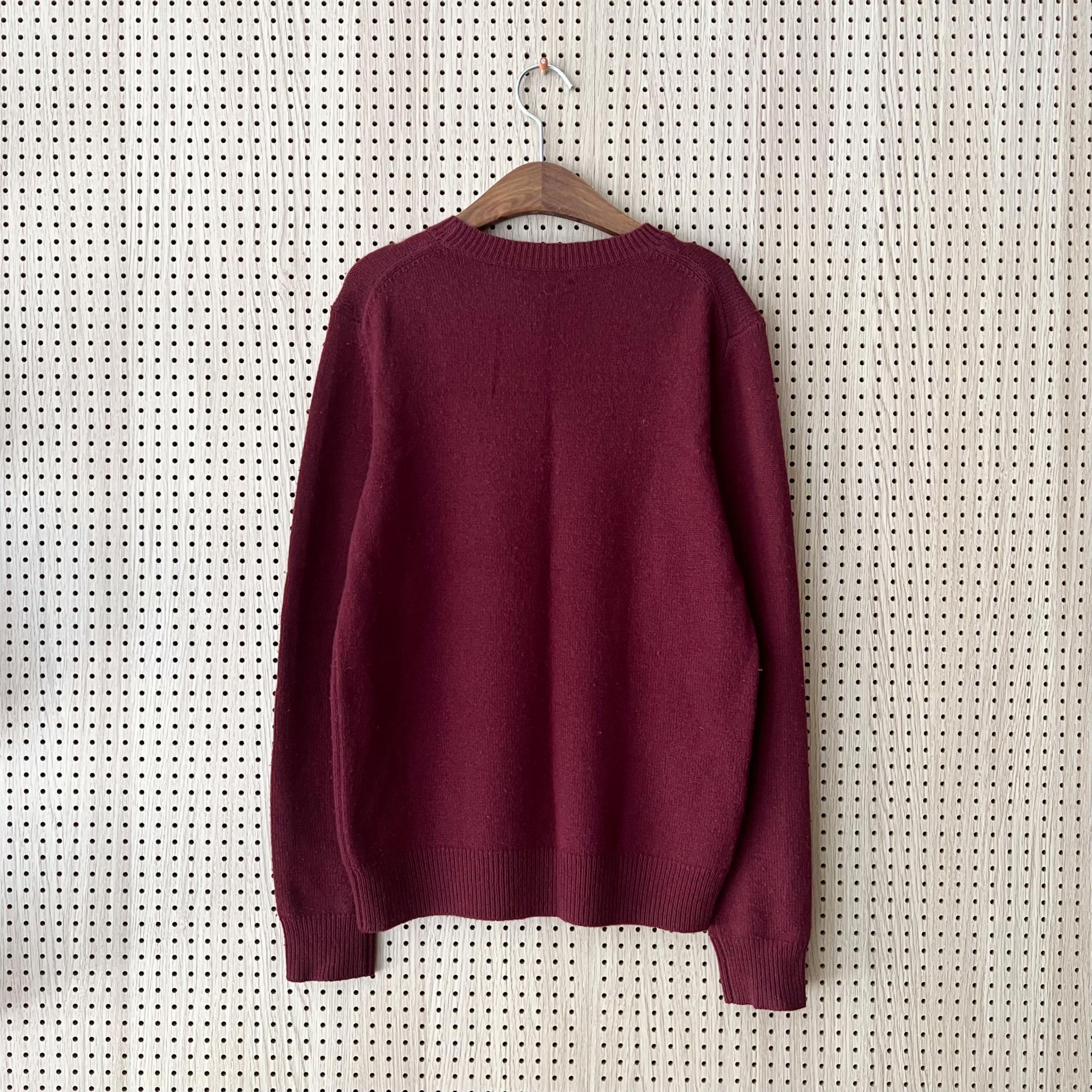 차분한 버건디 컬러가 돋보이는 니트입니다. 캐시미어와 울 혼방으로 까슬거림 없이 기분 좋은 촉감과 탁월한 보온성이 훌륭합니다. 택도 보관중이며 컨디션 역시 민트급입니다. 남성 XS 사이즈로 여성 M~L 정도 사이즈감입니다. 여성분들께도 적극 권해드려요.