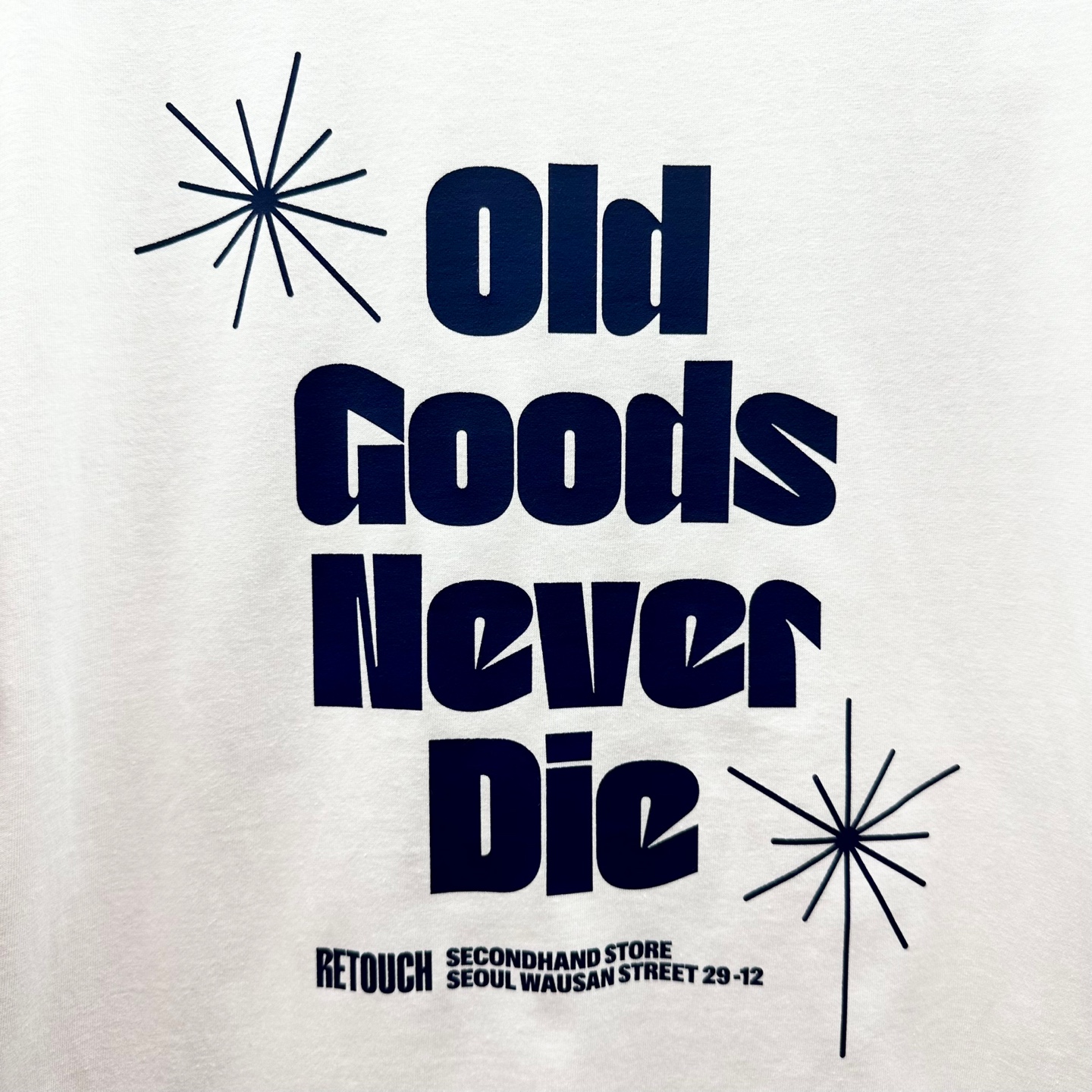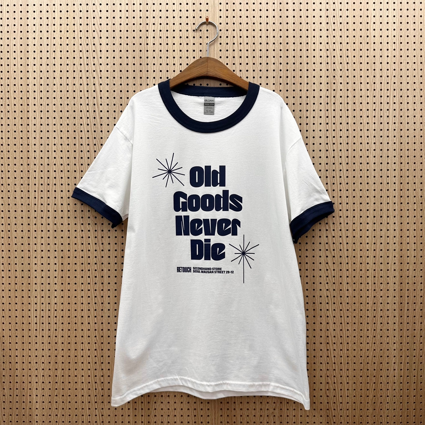 리터치샵의 슬로건인 'Old Goods Never Die'를 프린트한 링거 티셔츠입니다. 베이스 티셔츠는 길단 사의 링거티로써 클래식한 디자인과 적당한 두께감의 소재가 빈티지 무드를 잘 담고 있습니다. 빈티지러버 형제자매님들께 권해드려요.